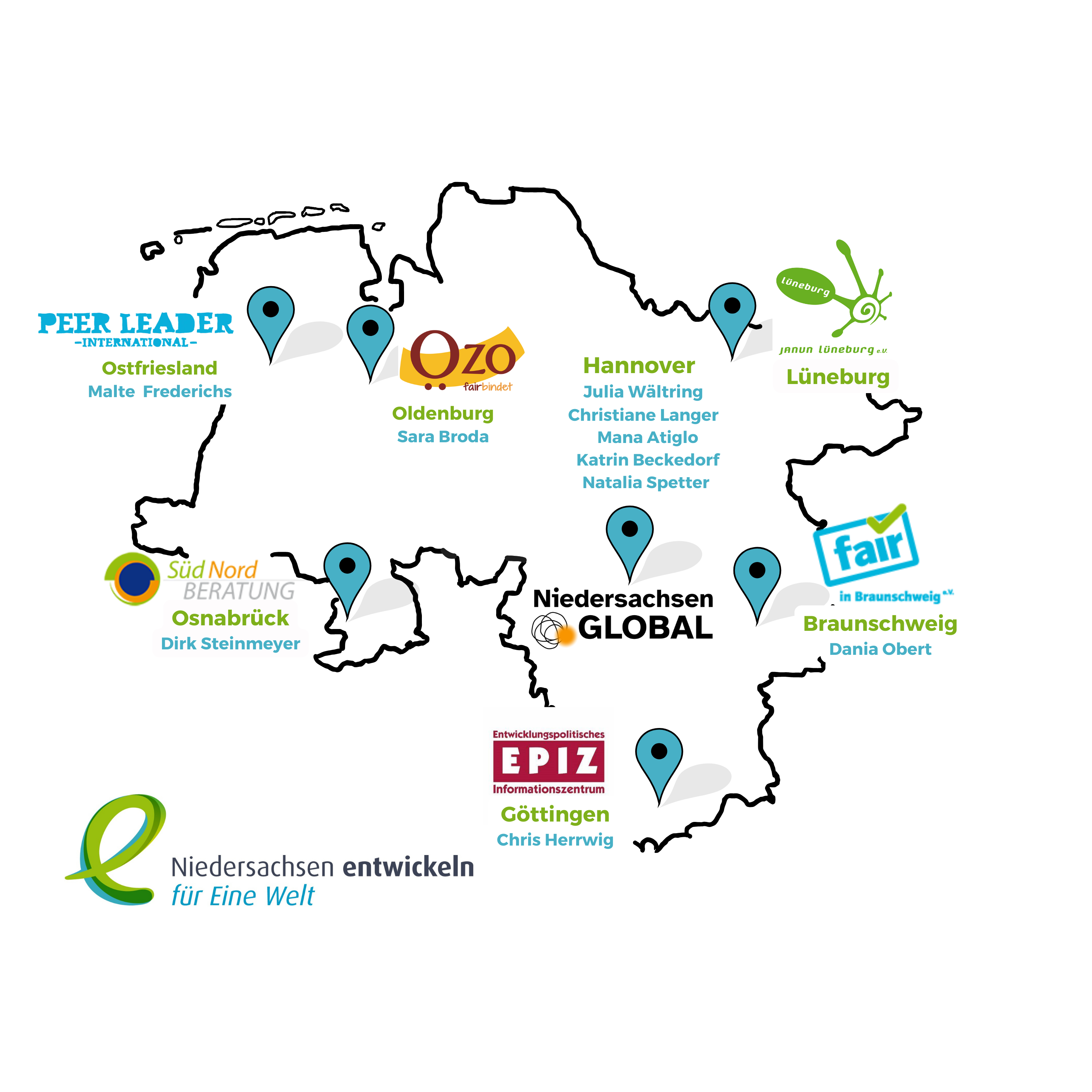 Die Regionalpromotor*innen bei Vereinen in Göttingen, Hannover, Braunschweig, Osnabrück, Oldenburg und Lüneburg und Ost-Rhauderfehn sind Knotenpunkte vor Ort. Sie beraten, vernetzen und qualifizieren Engagierte in den Städten und in den ländlichen Räumen der Region.