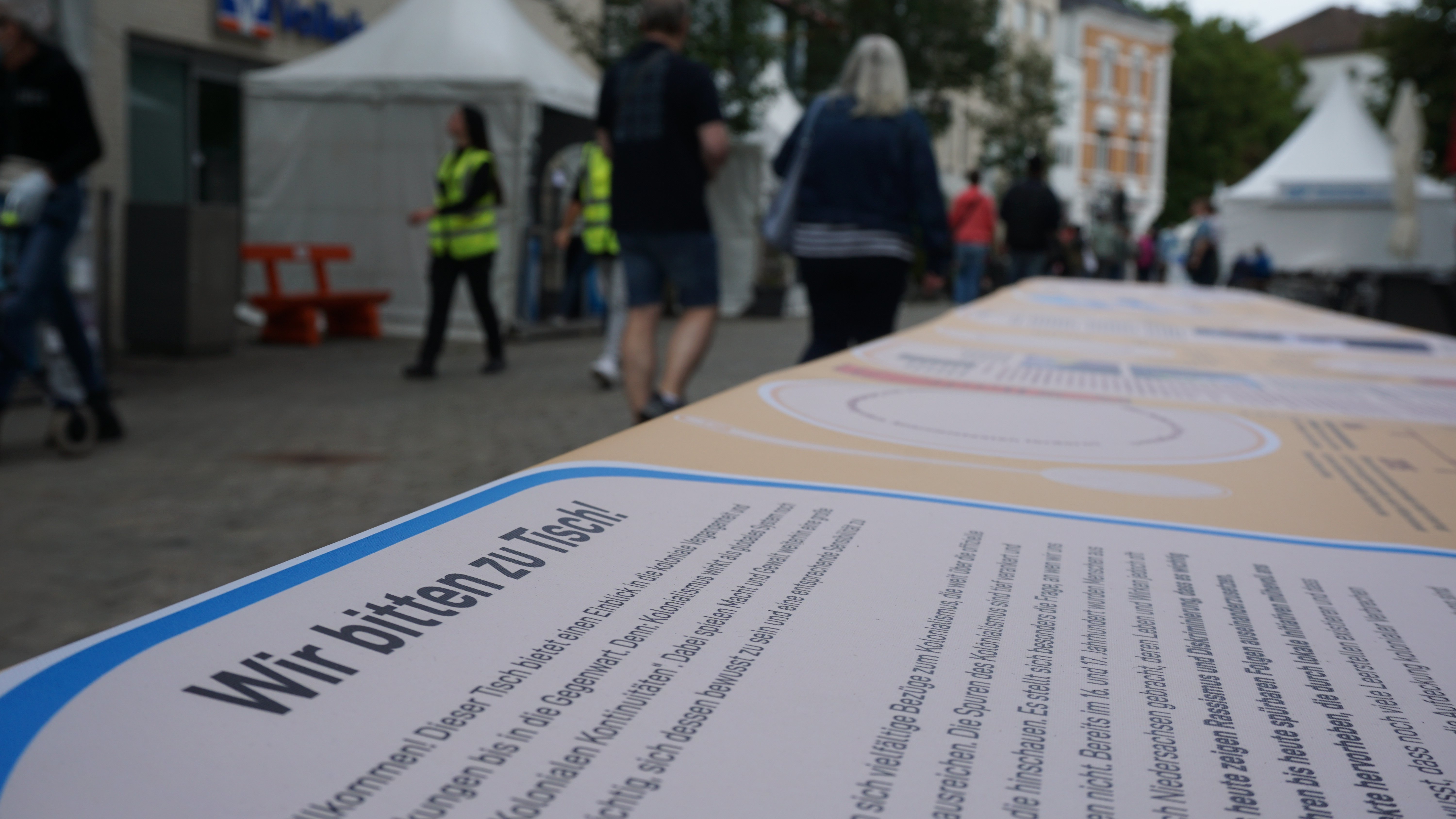 Die Ausstellung besteht aus einem bedruckten „Tischtuch“ mit dem Maßen 1 x 6 m. Es passt damit gut auf zwei Standard-Tapeziertische. Aufgrund der komplexen und gewaltvollen Inhalte der Ausstellung empfehlen wir den Umgang mit dieser erst ab 16 Jahren.